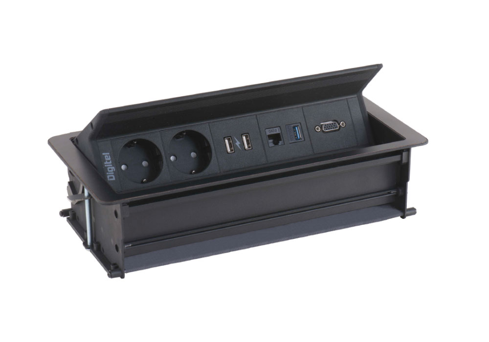 Boîtiers de prises escamotables, à encastrer sur les bureaux, les tables de réunion ou les pupitres informatiques.